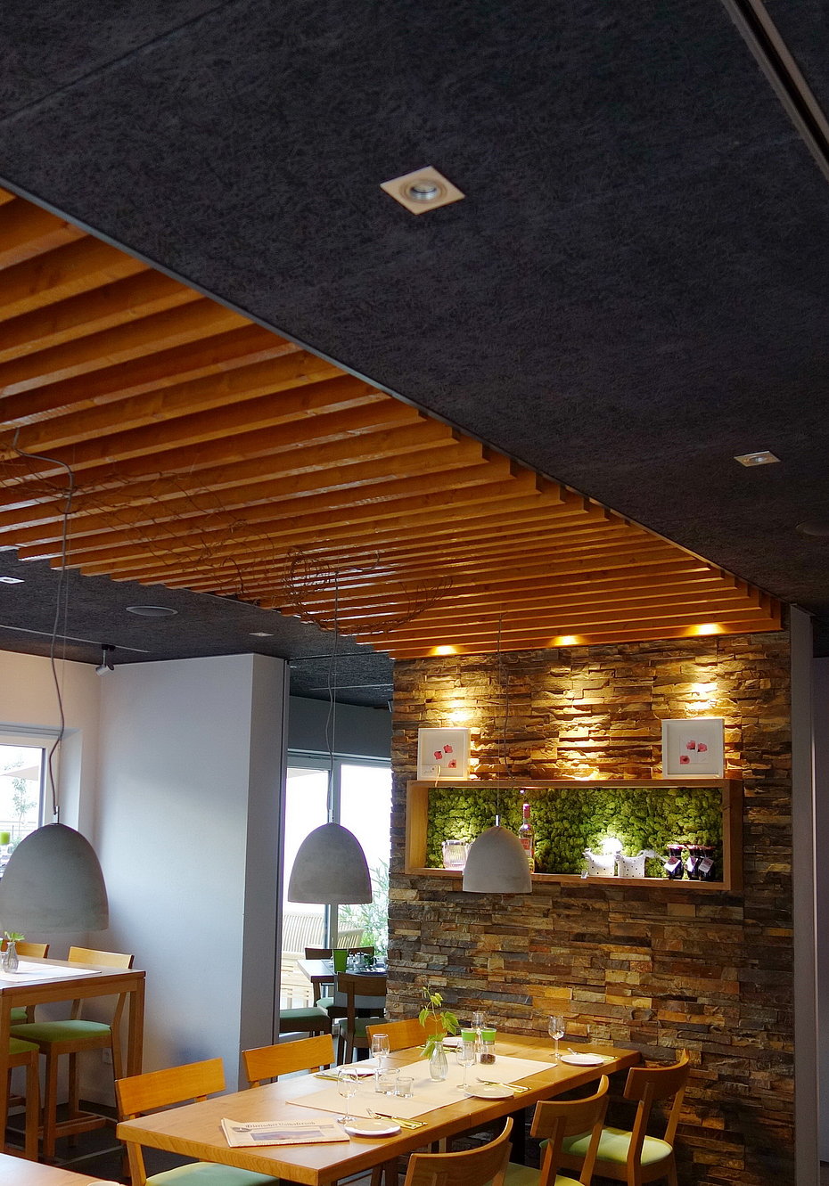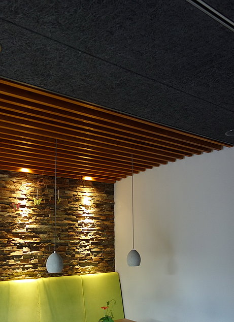 Eine spezielle Akustikpaneele, die offene, unregelmäßige Struktur und eine dämpfende Unterkonstruktion haben eine exzellente Wirkung entfaltet und nehmen den Schall da auf, wo er entsteht... Die dunklen und natürlichen Farben der Decke sorgen außerdem für eine Atmosphäre der geborgenheit.