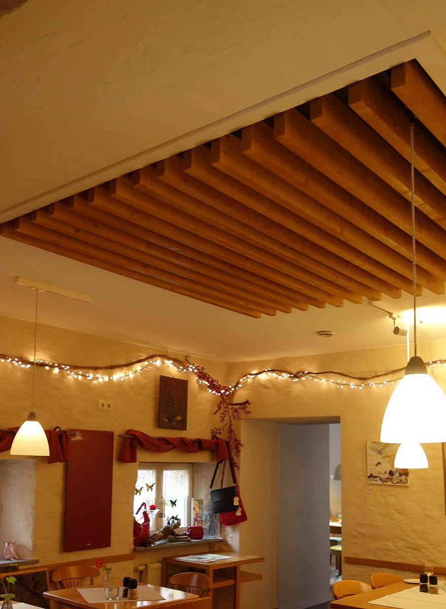 Nach den guten Erfahrungen in den neuen Gasträumen wurde auch die Deckenkonstruktion des alten Gastraums überarbeitet. Die ehemals geschlossenen Kassettenfelder der abgehängten Decke wurden geöffnet und mit einer offenen Gitterstruktur und Dämmstoff ausgestattet.