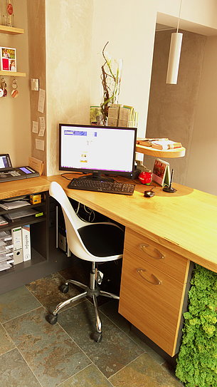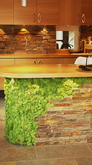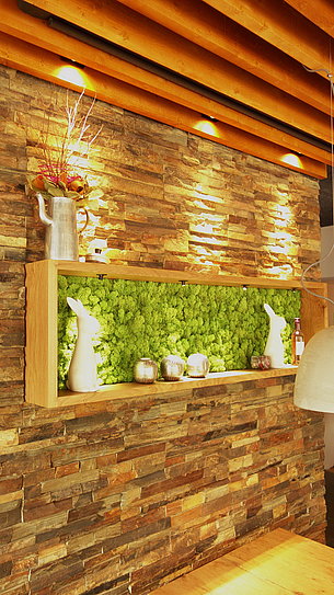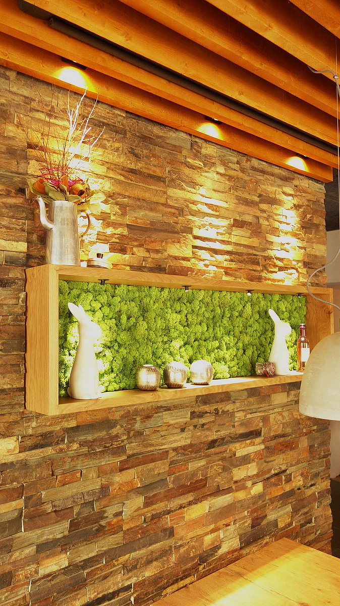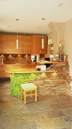 Auch in der kleinen Rezeption dominieren Eiche, Schiefer und Licht. Schreibtischplatte aus massiver Eiche, die Fronten des Rückschranks sind furniertund lackiert. Den Farbtupfer gibt die Thekenfront, die mit Moos begrünt ist.