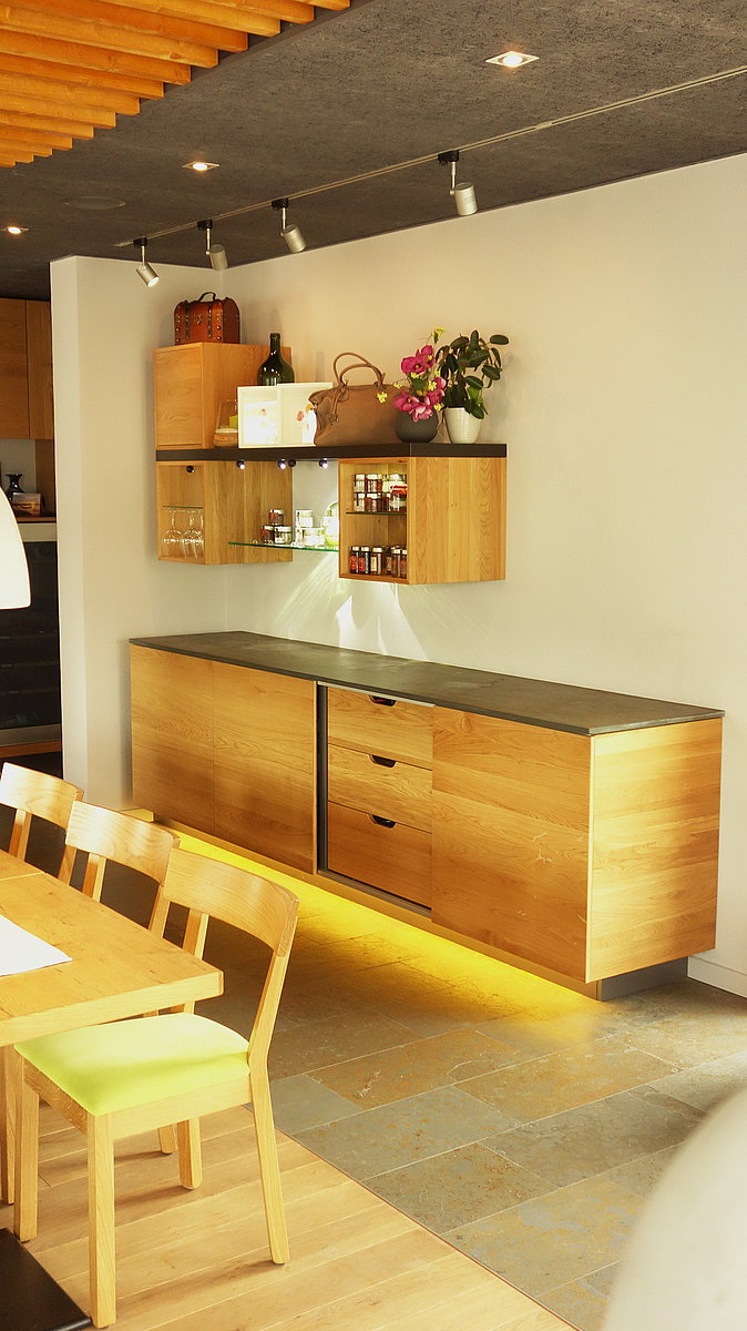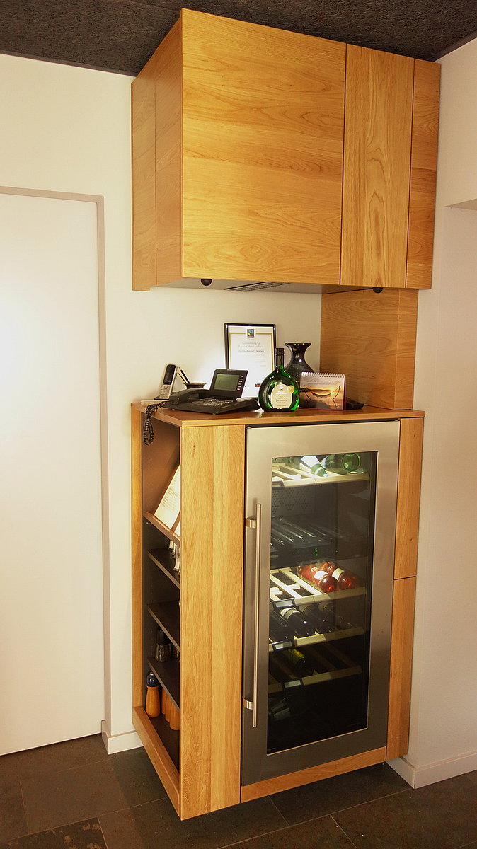 Die Möblierung ist aus massiver Eiche gefertigt und bietet Platz für das Buffet, Weinkühlschrank, Musikanlage und Deko.