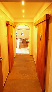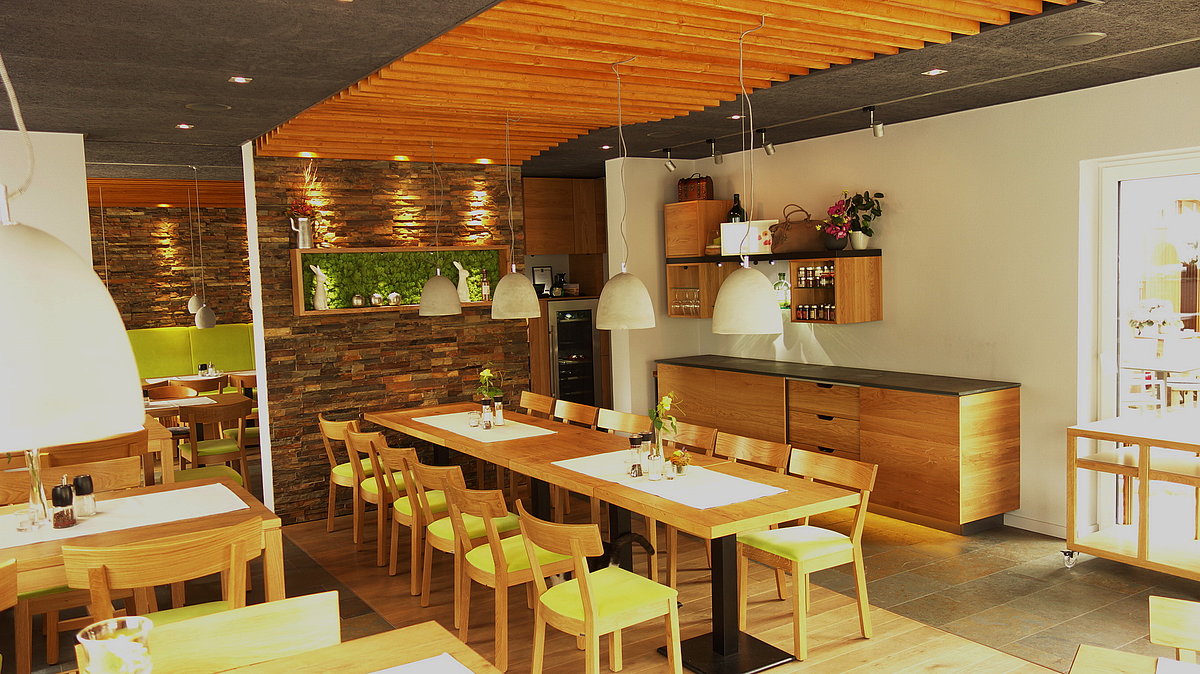 Einer der wichtigsten neuen Räume ist der neue Gastraum, der sich in einen großen und einen kleinen Raum teilt. Zwei raum hohe Durchgänge verbinden die Räume, sie können aber auch durch zwei Schiebetüren von einander getrennt werden. Ein wichtiger Faktor für die Gemütlichkeit in einem Gastraum ist die Akustik. Bei schlechter Akustik schaukelt sich der Lärmpegel mit steigender Gästezahl schnell hoch. Hier haben wir eine stark schallschluckende Decke konstruiert. Die homogene dunkle Fläche besteht aus schallabsorbierenden Platten, das wellenförmige Mittelteil öffnet die Decke und ist ebenfalls schallabsorbierend hinterlegt. Eine Stromschiene nimmt die von uns gelieferten Pendelleuchten auf. Tische und Stühle wurden von der Firma Rohde zu geliefert. Alle Naturschieferelemente wie Bodenbelag, Buffetplatte und Wandverblender wurden von der Firma Backes www.schiefer-fachmann.de  geliefert.