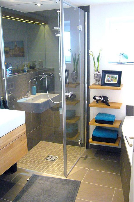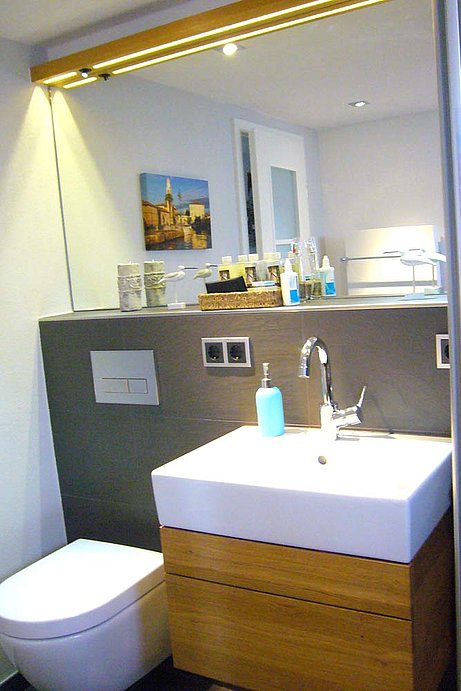 Dunkle Fliesen lassen ein edles Ambiente entstehen, die Duschkabine aus Glas macht den Raum optisch kaum kleiner, eine Raumspar Badewanne, leider kaum für zwei geeignet. Das Eichenholz des Handtuchregals und des Waschtischcontainers bringen ein warmes Material in den Raum, die hellen Wand- und Deckenflächen, wie auch der große Spiegel mit Beleuchtung geben dem Raum Größe, die er eigentlich nicht hat.