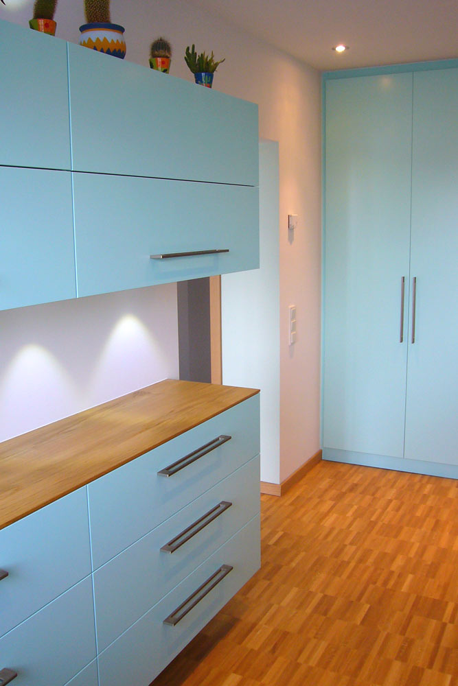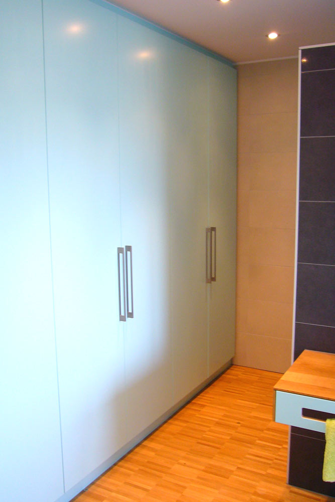 Der raumhohe Kleiderschrank mit sechs hohen Türen bietet viel Stauraum mit Fachböden, Kleiderstangen und zwei Kleiderliften. Der Schrank wurde ins Bad verlegt, da der Schlafraum ein großes Fenster hat und nicht genug Wandfläche bietet.