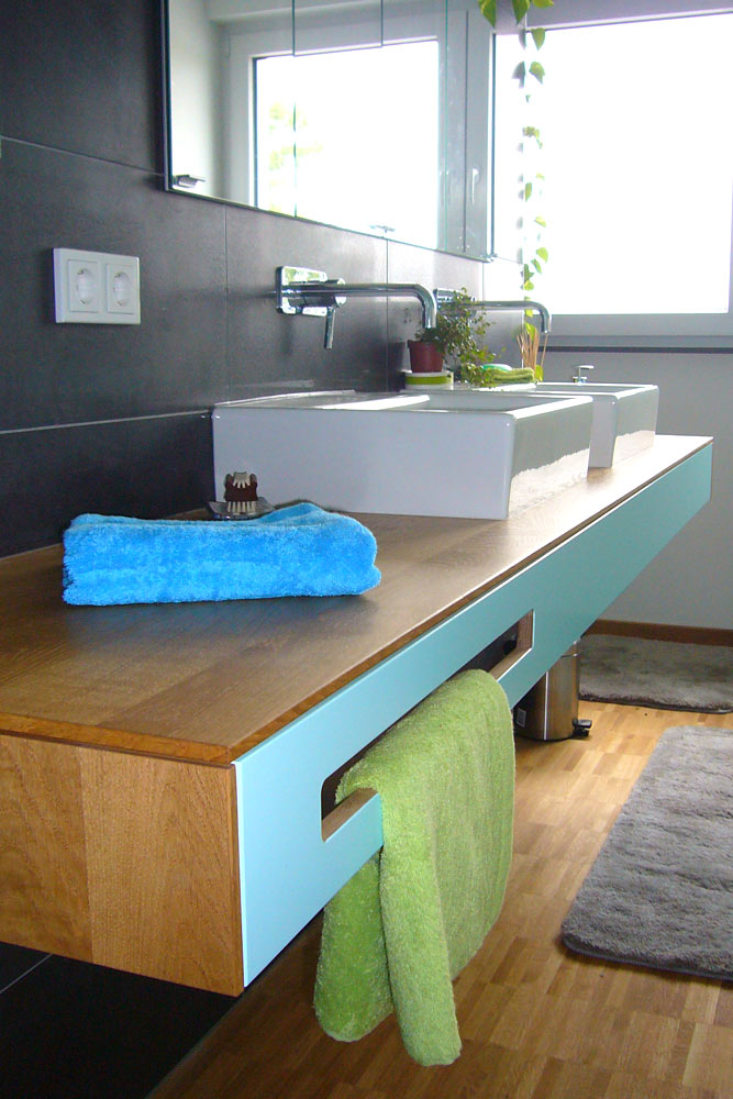 Der schwebende Waschtisch hat eine großzügige Ablagefläche, die auch als Stellfläche für die beiden Handwaschbecken dient. Die türkisfarbene Blende verdeckt die Installation und fungiert mit dem Langloch als Handtuchhalter.