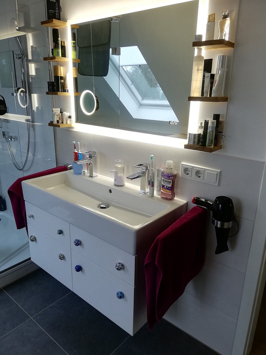 Das wandhängende Waschbecken wurde nachträglich mit einem Unterschrank mit vier