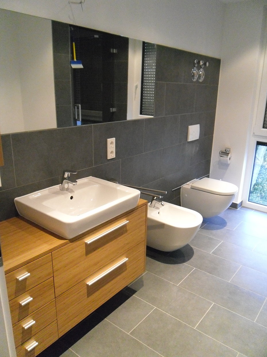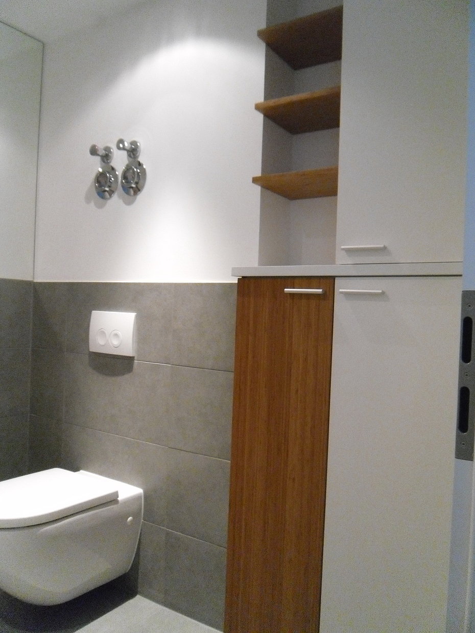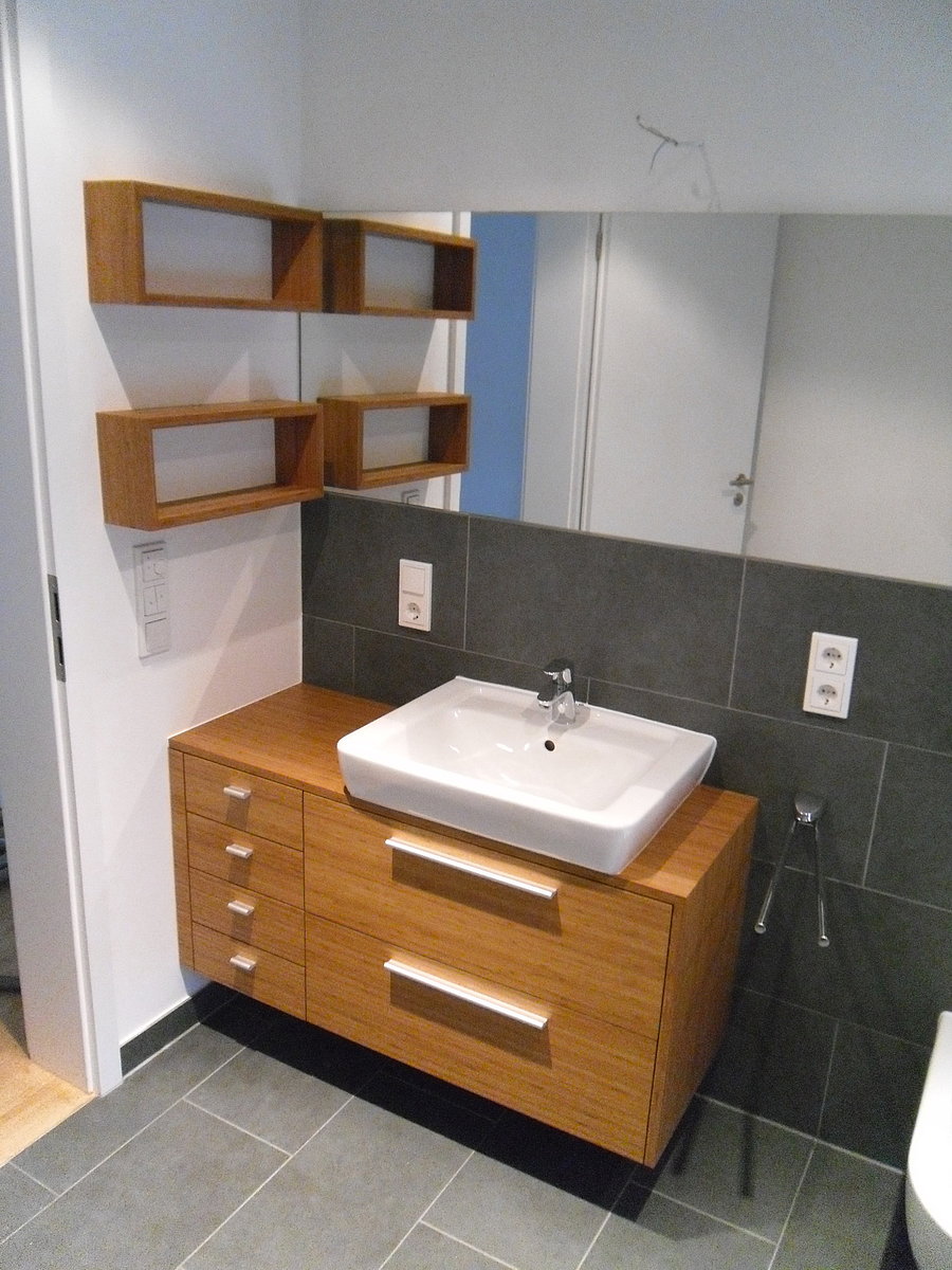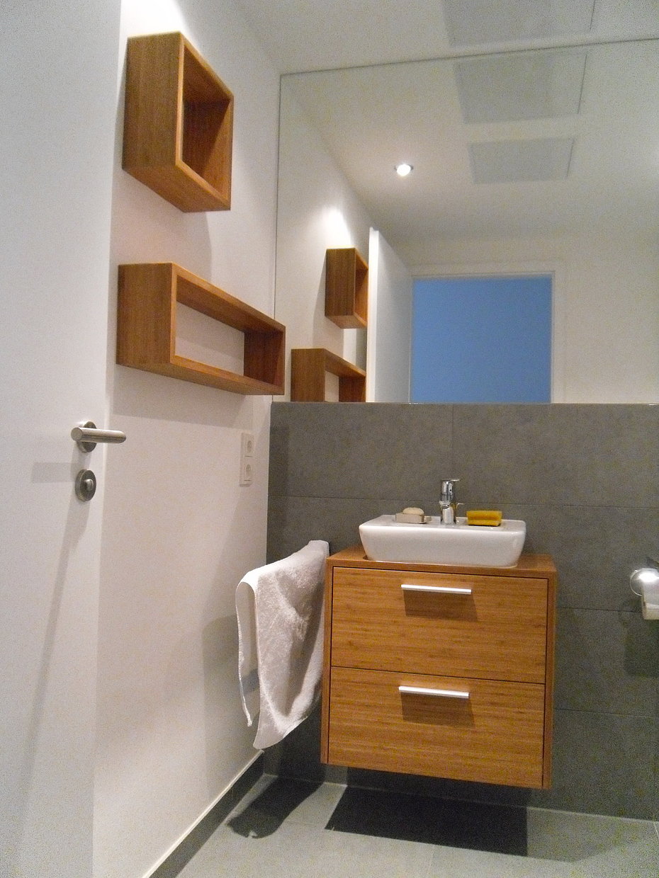 Der schwebende Waschtisch bringt mit dem kontastierenden Bambusfurnier den gewünschten Farbtupfer in das Bad. Durch die Spiegelung der Regalkuben wird das Material zusätzlich wiederholt um noch mehr Farbe ins Bad zu bringen.