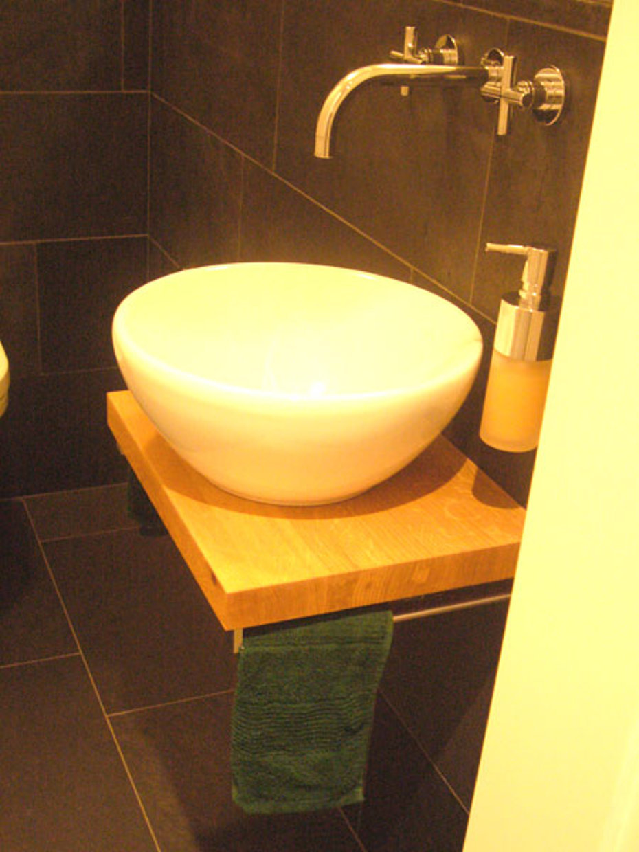 EIn "schwebendes" Eichenbrett ist der Waschtisch auf dem das elegante Rundbecken sicher steht. Die Befestigung der Platte ist unter den Fliesen verborgen, sie sollte schon im Rohbau mit bedacht werden.