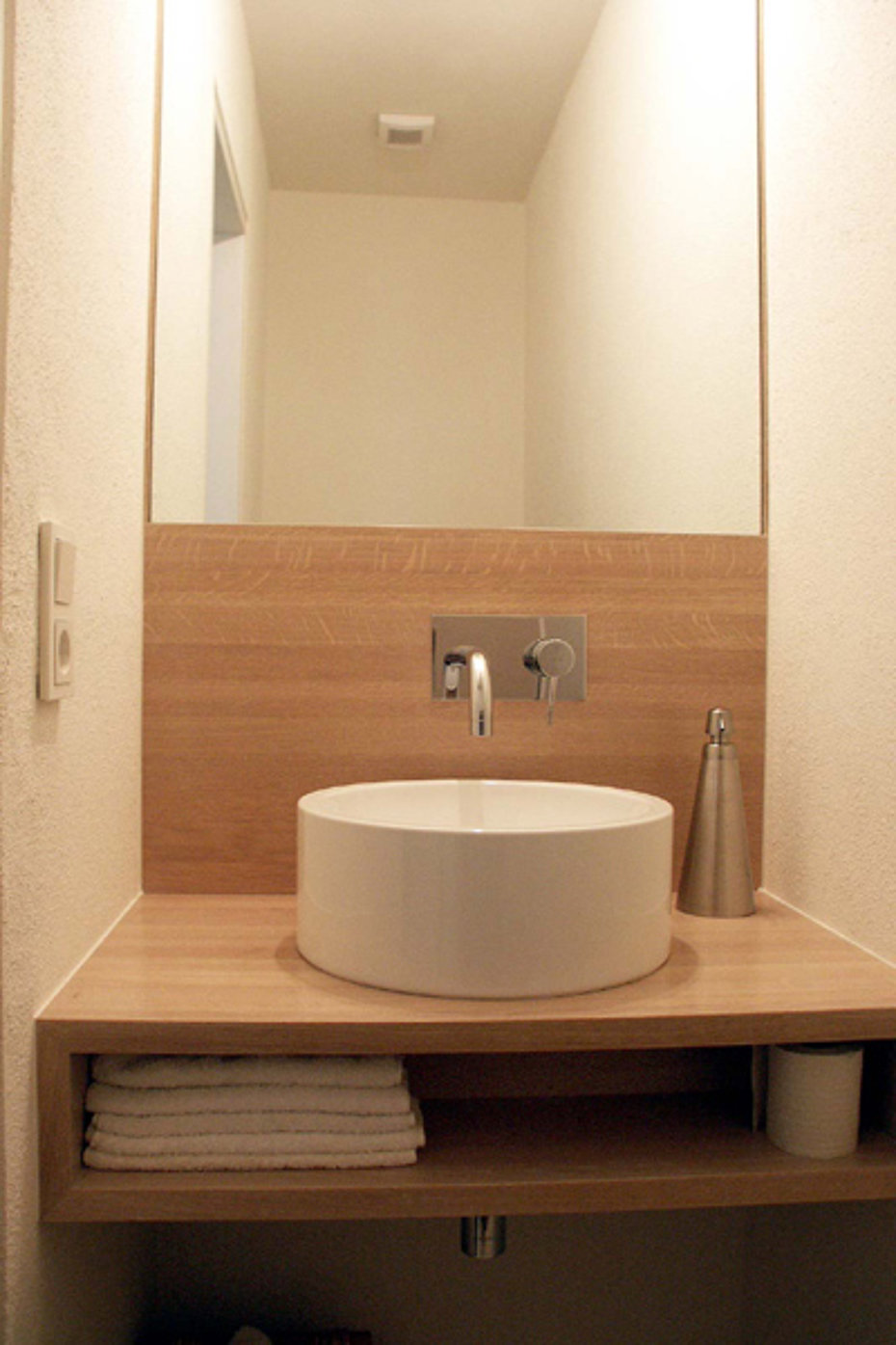Der Waschtisch mit seiner Rückwand reicht in dem schmalen WC von Wand zu Wand und bildet so eine sehr solide Unterlage für das kreisrunde Emailbecken. Auch die Wandarmartur hat optisch einen festen Halt in der Rückwand und der raumbreite Spiegel verdoppelt das Volumen des Raums.