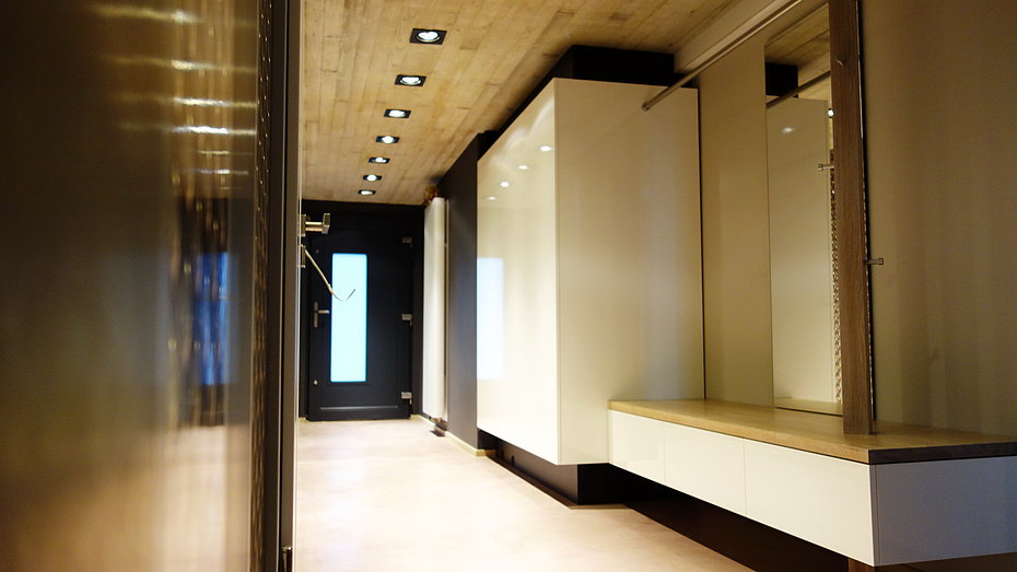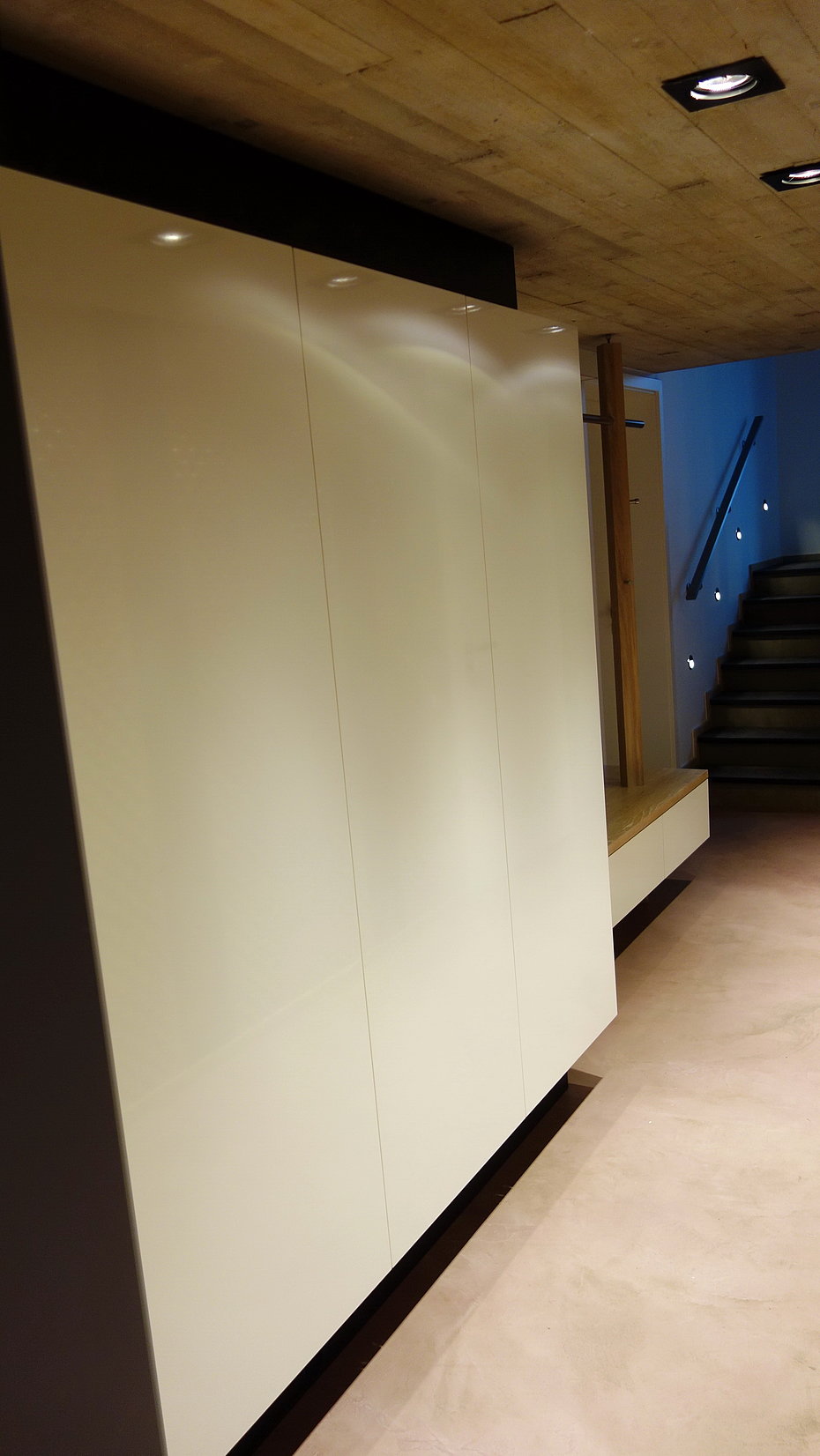 Diese Garderobe ersetzt im Grunde den Hausanschlussraum. Die Front des Garderobenschranks besteht aus drei Türen, die auf Druck öffnen. Die rechte und die mittlere sind eher unspektakulär und verschließen Schränke mit Einlegeböden, die linke verbürgt mehr. In diesem Schrankteil stecken Wasser-, Strom-, Gas- und Telefonanschlüsse. Schrank und Sockel sind mit einigen Lüftungsgittern ausgestattet um einen Gasstau zu vermeiden.