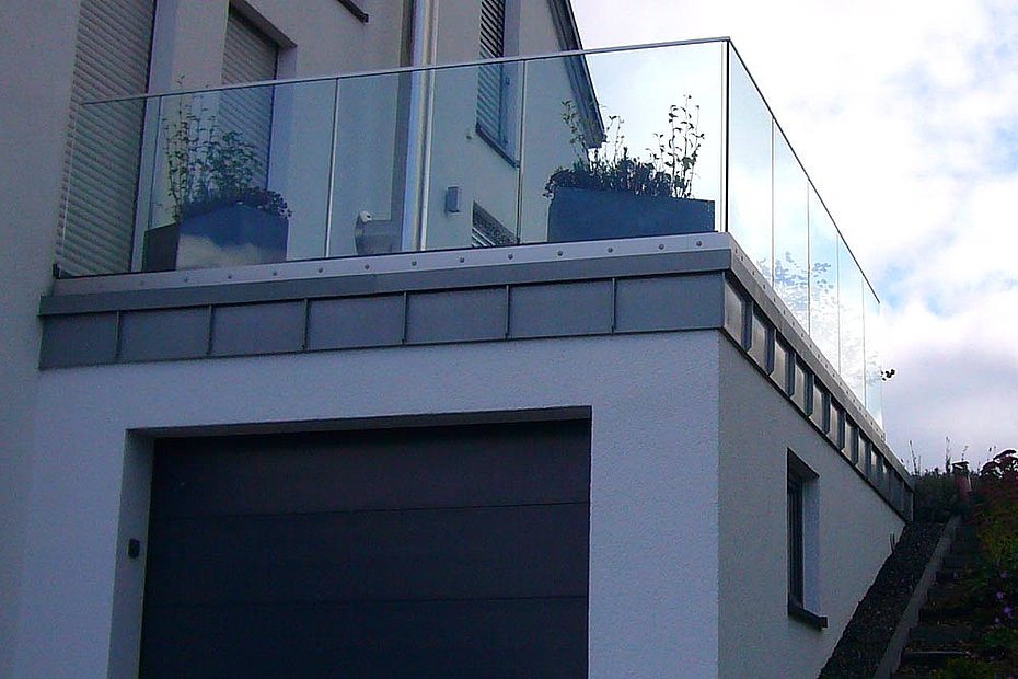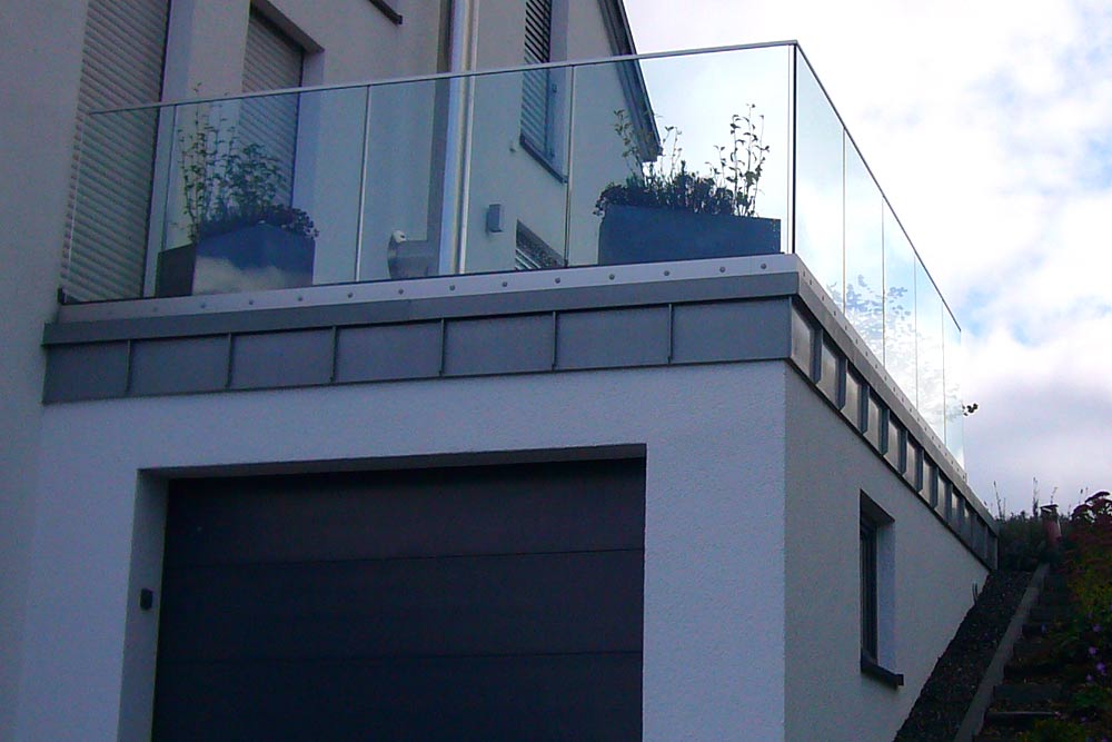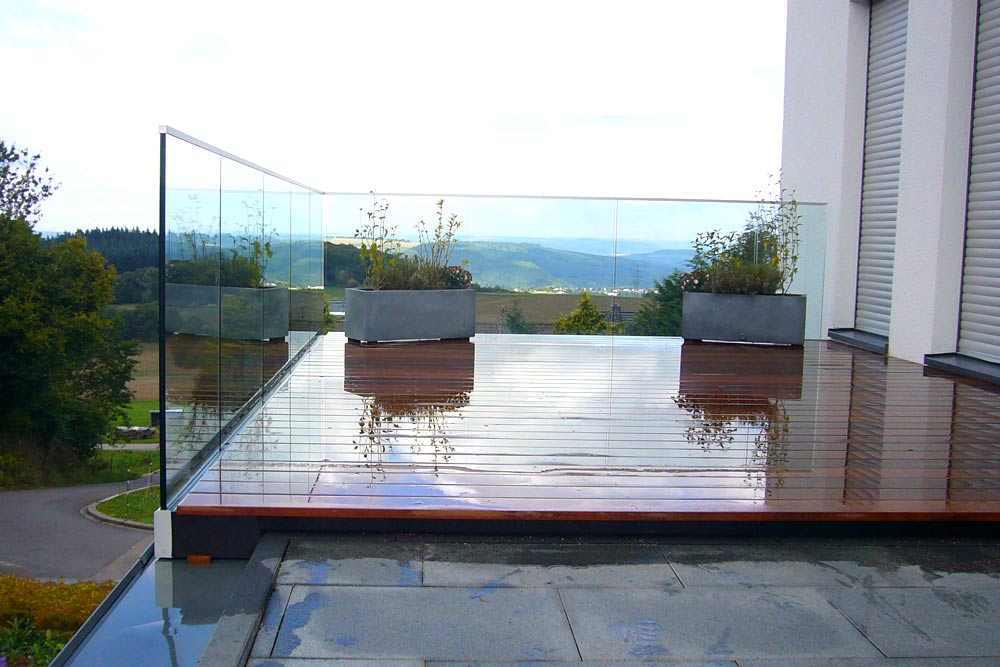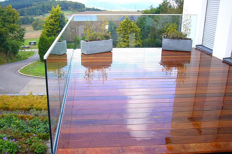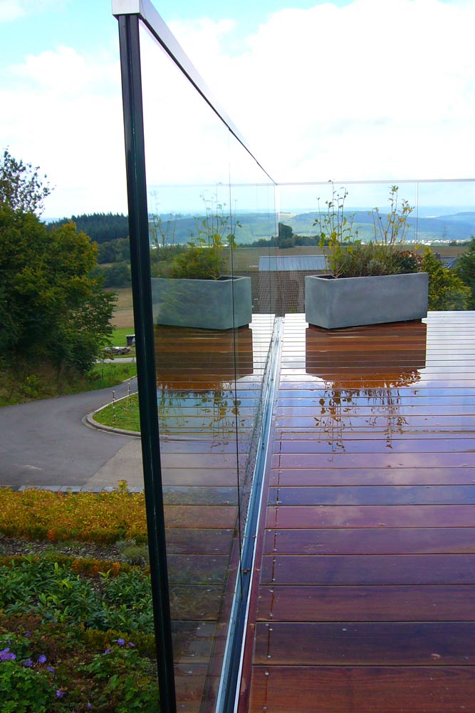 Die Fläche des Garagendachs wurde immer schon als "Sonnenwiese" genutzt, ein grober Split aus Schiefer hat die Nutzung aber etwas eingeschränkt und auch ein Geländer war nicht vorhanden. Mit dem Belag aus Ipé Dielen (FSC Zertifiziert, FA. Kay Pannier, Trier) und der Brüstung aus 16mm Sicherheitsglas ist ein zusätzlicher Wohnplatz geschaffen worden.
