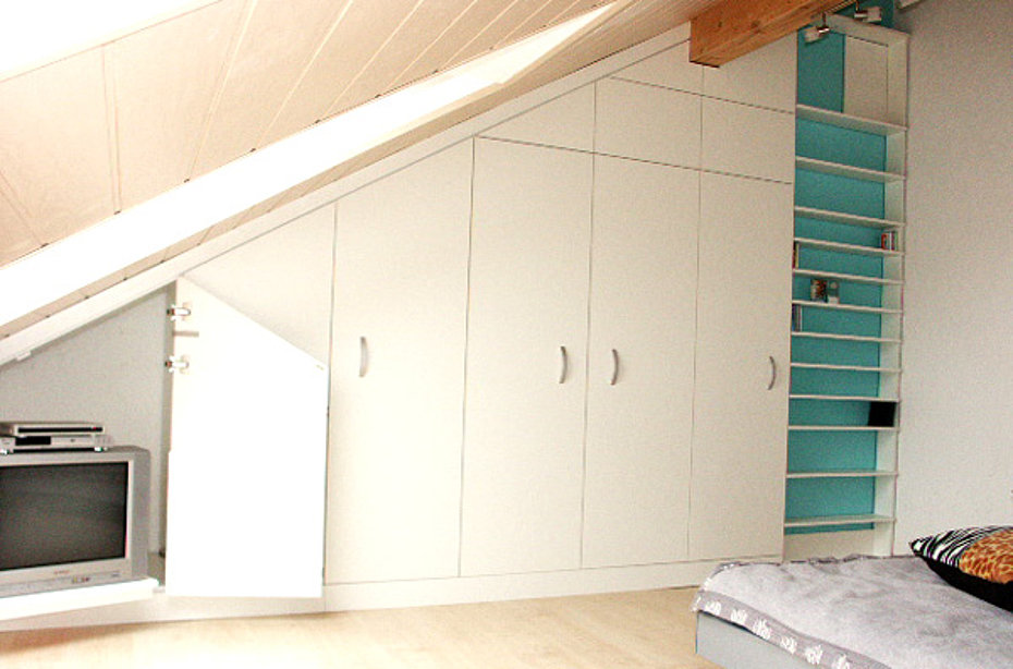 Die Dachschräge steckt voller Überraschungen. Jeder hat seine Vorstellung was mit ihr oder in ihr passiert. Bei der Wohnflächenberechnung werden Dachschrägen erst ab einer bestimmten Höhe mit gerechnet. Zu recht, aber auch die nicht berechnete "gratis" Fläche lässt sich nutzen. Wir haben für Ihren Bedarf sicher eine Lösung, die sowohl praktikabel, wie auch ästhetisch ist mit Möbeln für die Dachschräge, egal ob längs oder quer.