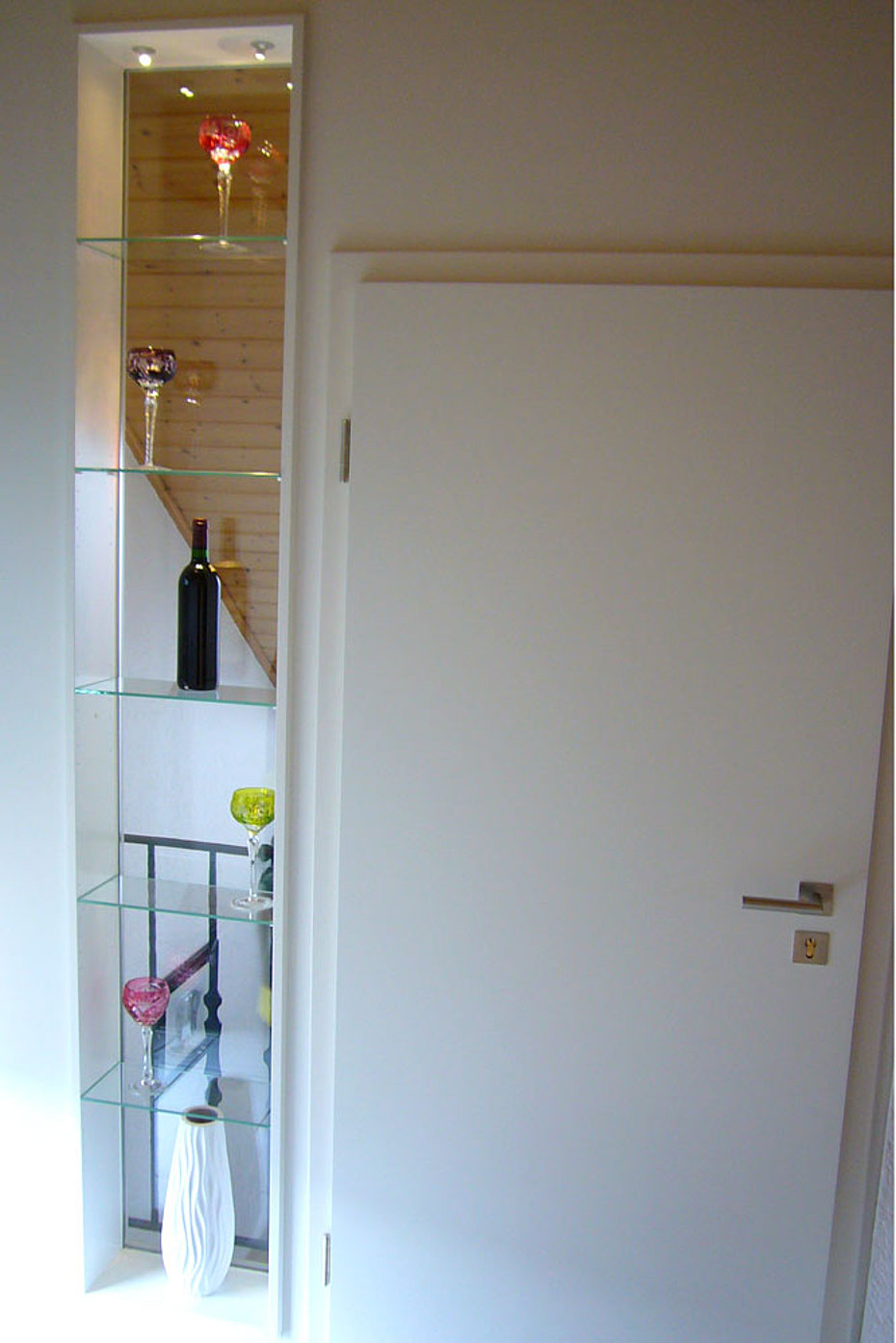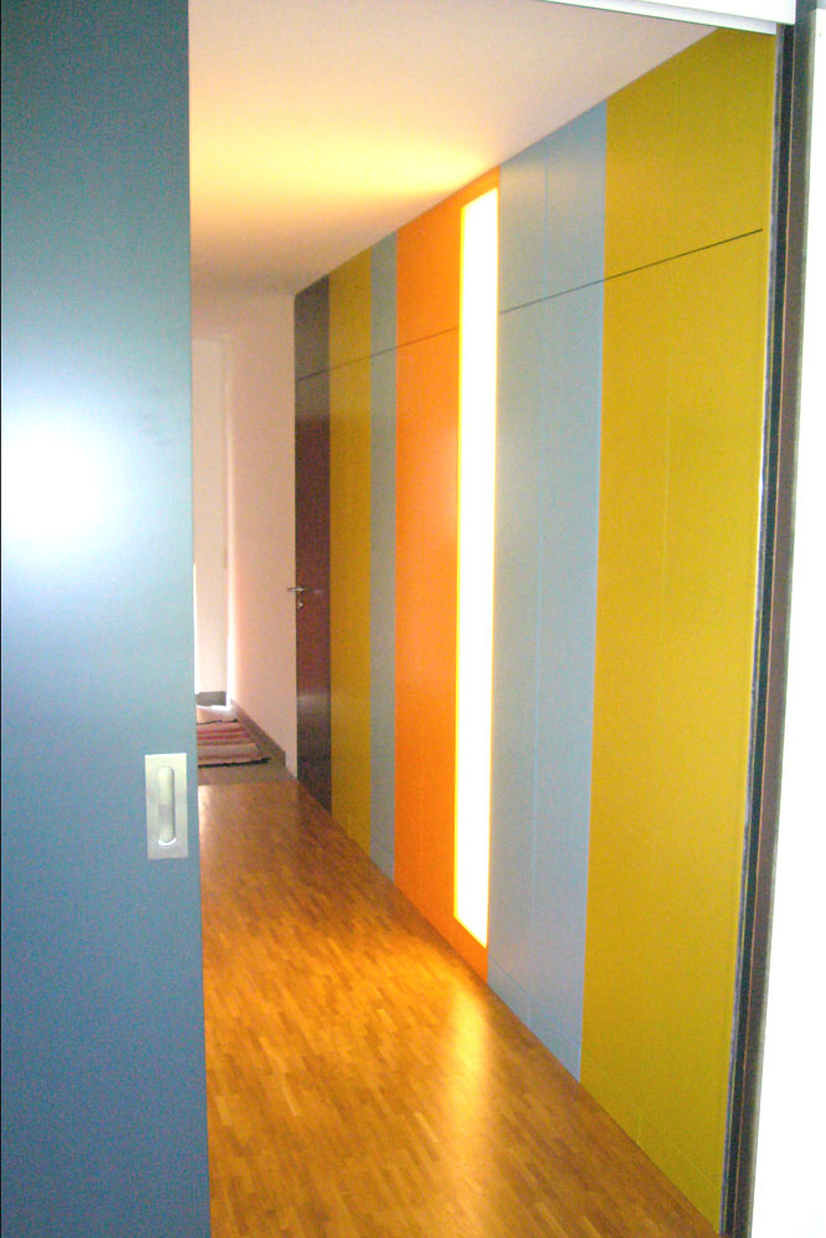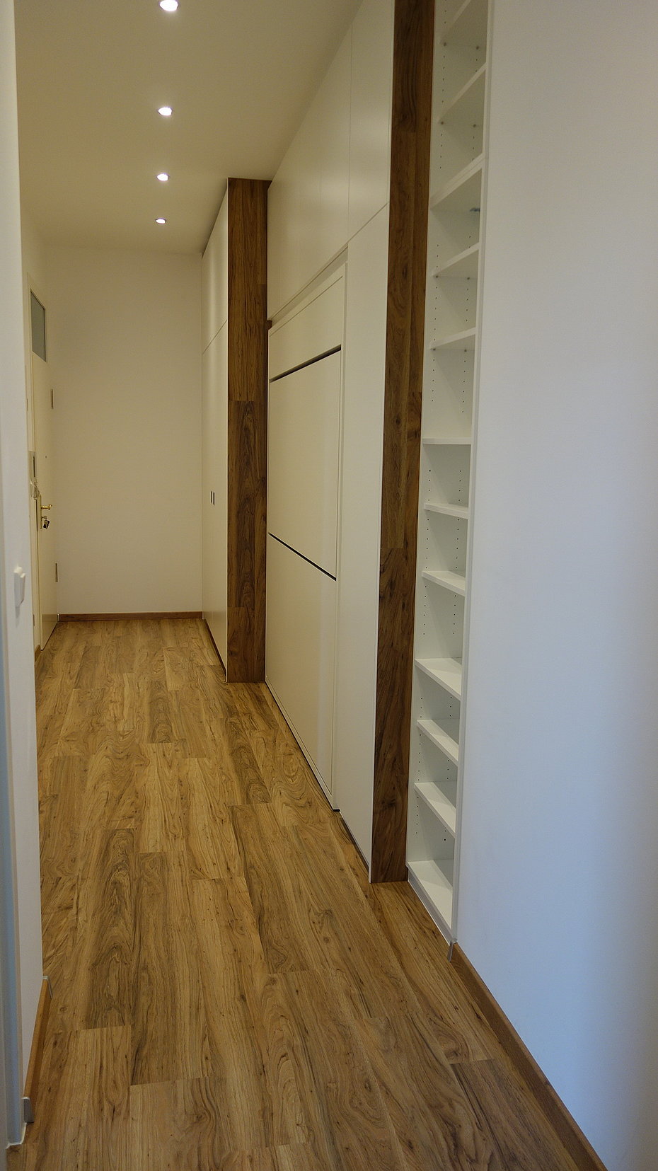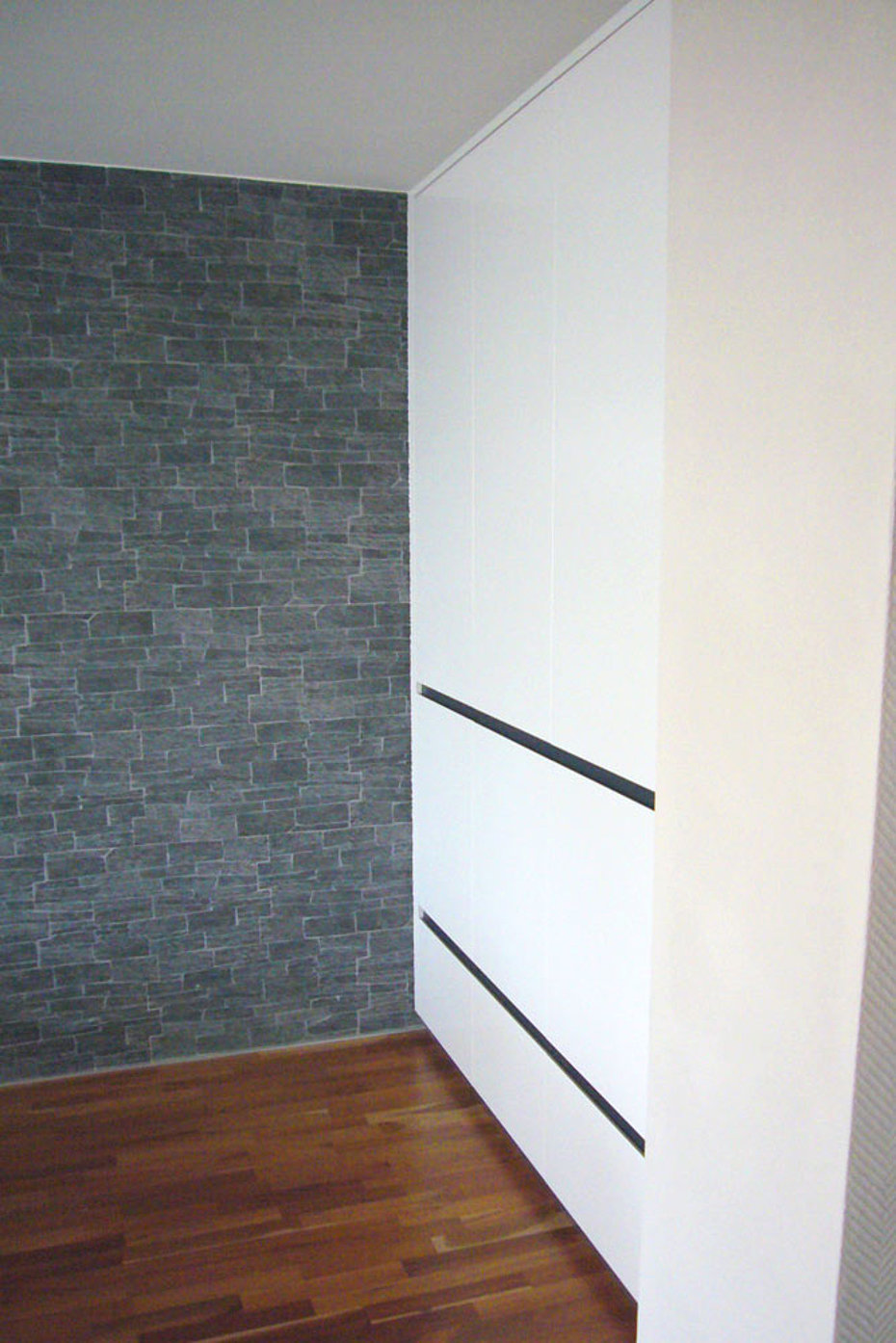 Eine tiefe Nische im Raum erhält eine neue Aufgabe. die 120 cm tiefe Nische ist mit einem 80 cm tiefen Stauschrank ausgebaut. Die großflächigen Fronten mit ihrer horizontalen Teilung durch die Griffleisten erhellen den Raum und lassen den Stauraum verschwinden.
