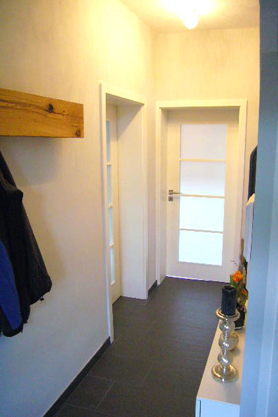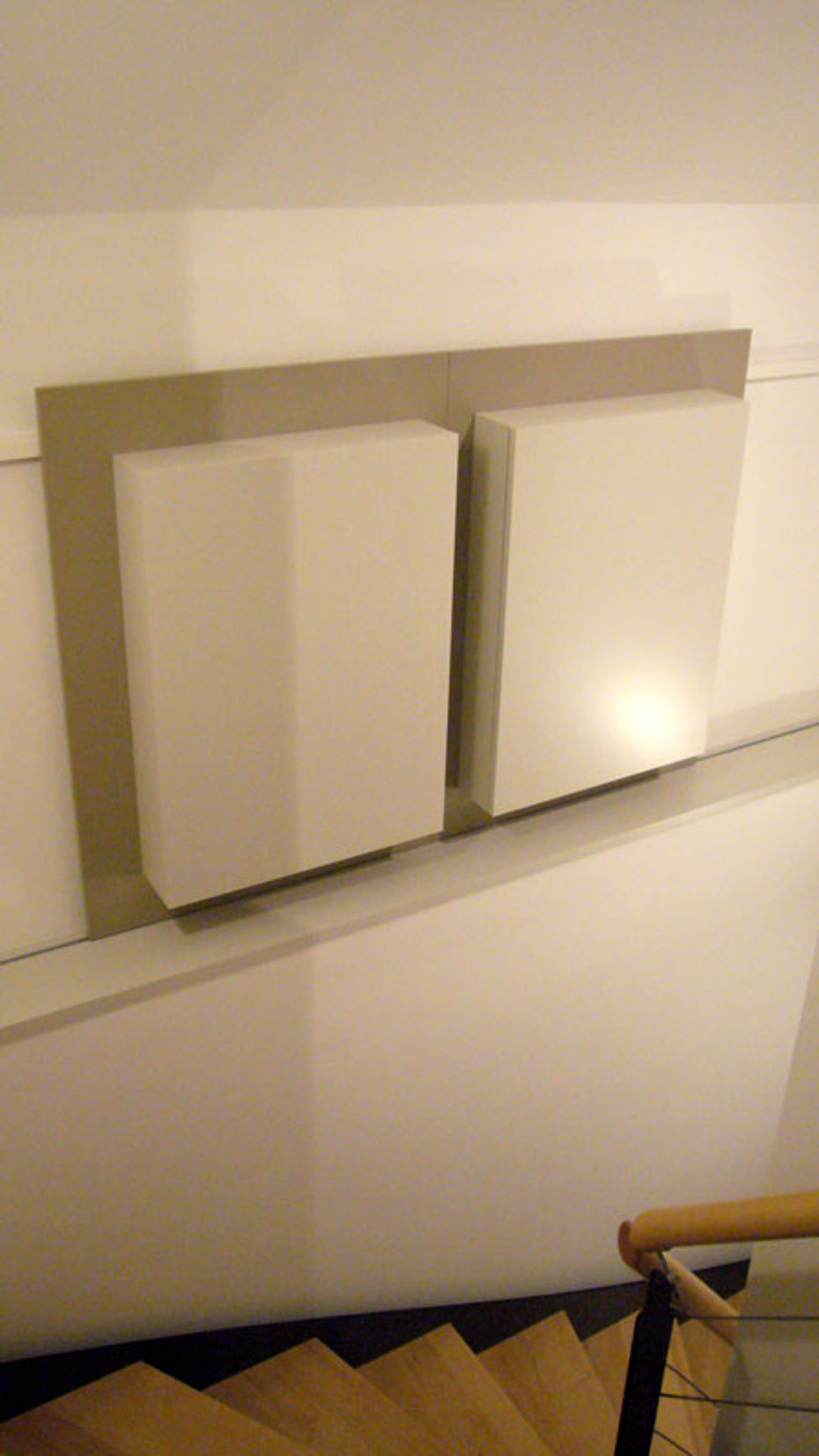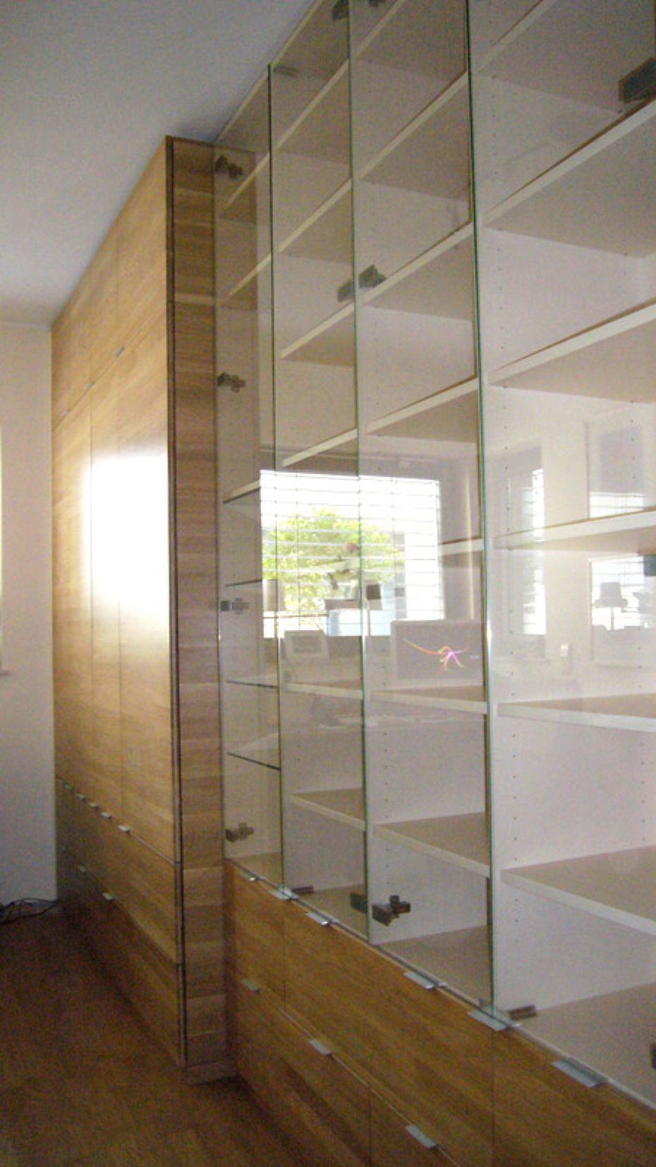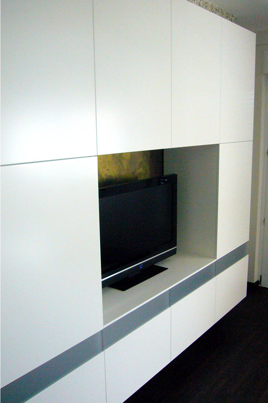 Eine tiefe Nische im Raum erhält eine neue Aufgabe. die 120 cm tiefe Nische ist mit einem 80 cm tiefen Stauschrank ausgebaut. Die großflächigen Fronten mit ihrer horizontalen Teilung durch die Griffleisten erhellen den Raum und lassen den Stauraum verschwinden.
