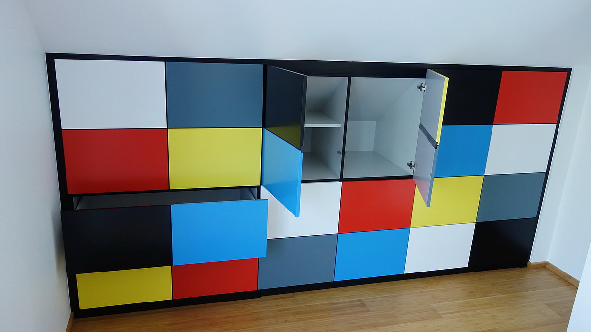 Der Schrank ist in einer Dachschrägen eingebaut und bietet viel Staufächer hinter den oberen Türen und zwei große Schubkästen. Rechts unten ist für den entspannten Büroschlaf oder für schlafbedürftige Gäste gesorgt. Türen, Schubkästen und Klappen sind mit Drucköffnern ausgestattet um die Besonderheit Der Front nicht mit Griffen zu stören.