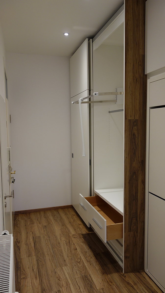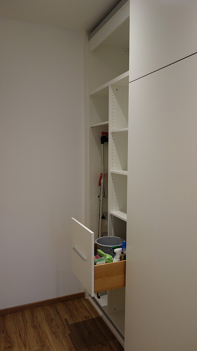 Der linke, tiefe Teil des Schranks beinhaltet hinter zwei flächenbündigen Schiebetüren links einen Putz und Vorratsschrank und rechts eine Garderobe mit Kleiderstange, Kleiderlift und zwei großen Schubkästen.