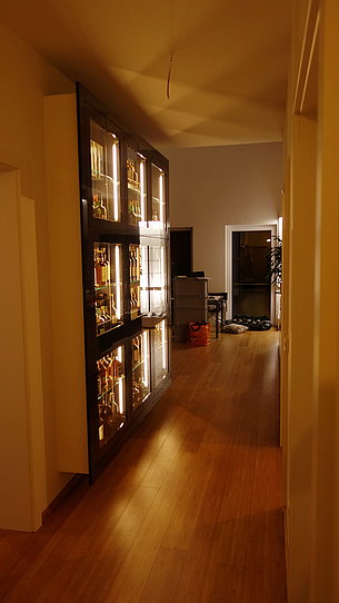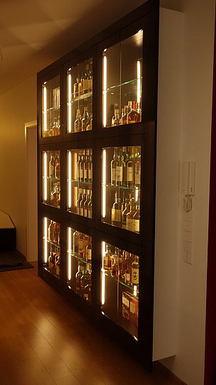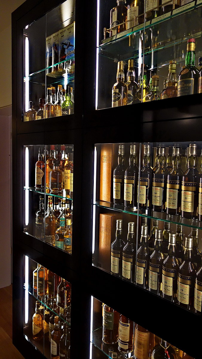 Diese Whiskythek ist ein besonderer Hingucker und war in vielerlei Hinsicht eine Herausforderung. Die Breite des Flurs soll nicht zu stark eingeschränkt werden, das Möbel soll an der Wand hängen und Platz für etwa 140 Flaschen bieten. Alles geschafft!