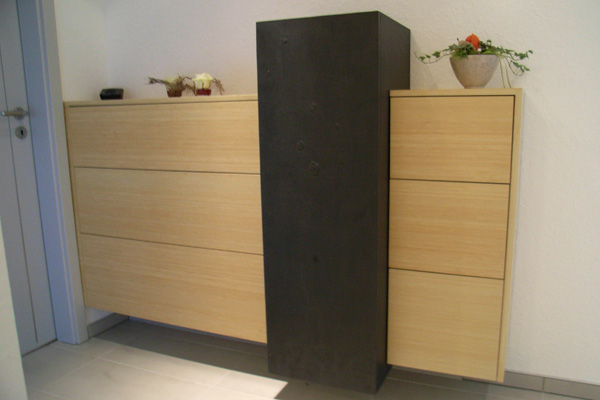 Die Materialien Bambus und Schiefer bilden in diesem hängenden Highboard den denkbar größten Kontrast. Der dunkle Quader ist mit echtem Schiefer belegt. Das Material ist in Größe und Einsatzbereich begrenzt aber für vertikale Flächen wie hier ein absoluter Hin Gucker. Die Bambuslagen verlaufen hier horizontal und unterstreichen mit Hilfe des Fugenbilds den liegenden Korpus. Dieses Möbel kann in den verschiedensten Räumen Verwendung finden, hier ist es im Eingangsbereich aufgehängt.